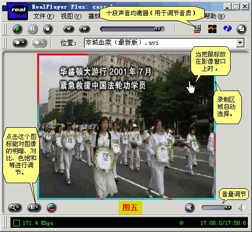 选到正确的录音音源后,在录制时就会看到如“图四”一样的彩条,那是录制的音量大小的动态显示。按“图三”的说明,仔细地调节录音音源的音量和Real Play的音量,使录像在最高的音量时,彩条也不要达到顶端,而要留有一定的余地。在正常音量情况下,彩条在不达到红区为好,当然最佳的选择还是用对此试听的办法来决定。
