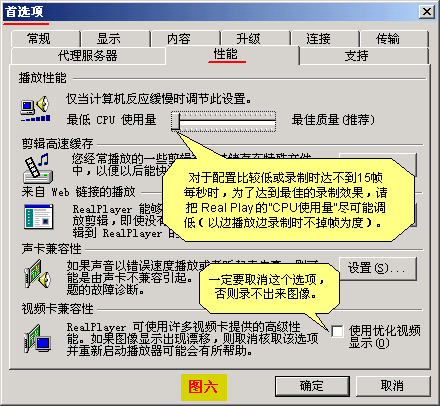7、对Real Play的设置。从Real Play的菜单“视图”下的“首选项”进入设置对话框。如“图六”,点击“性能”选项。把CPU使用量尽可能地调低,并把左下角的“使用优化视频显示”选项取消(不取消就录不出图像来,同样地如果对其它播放程序进行录制时录不出图像也可能是这个原因,如“超级解霸2001”,就需要把“视频”下的“单显示器设定”中的“使用硬件YUV加速显示”取消,下次再运行“超级解霸2001”的时候就能录下图像了),按“确定”退出设置。然后退出Real Play再重新运行Real Play,这时上述选择才生效(一定要重新运行Real Play,否则还是录不出图像)。