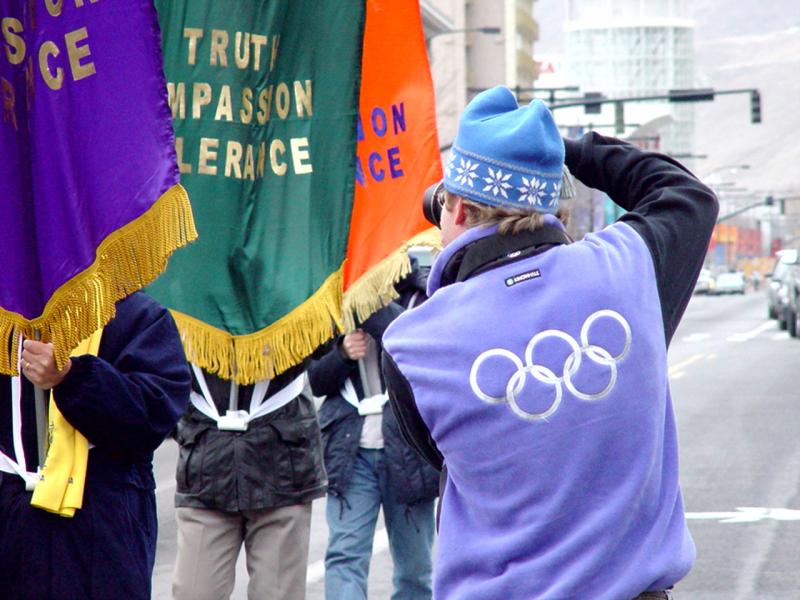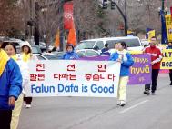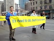 步行的队伍成两纵队,在纷扰拥挤的市区缓缓前进,只有「普度、济世」的音乐一路相伴。领队的两位学员手举「法轮大法」的横幅,这是整个队伍中最醒目的了。部分学员在街道两侧发大法资料,其他的人则手持印有「真善忍」的黄色三角旗。小旗儿在风中的飘动,恰似一只只飞舞的黄色彩蝶,努力地妆点灰色的天空。在路旁的老婆婆看到了竟也想跟着走,但她低头看看自己的衣裳,再看看学员清一色的黄色运动服,她腼腆地笑一笑,挥手道祝福。