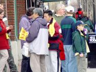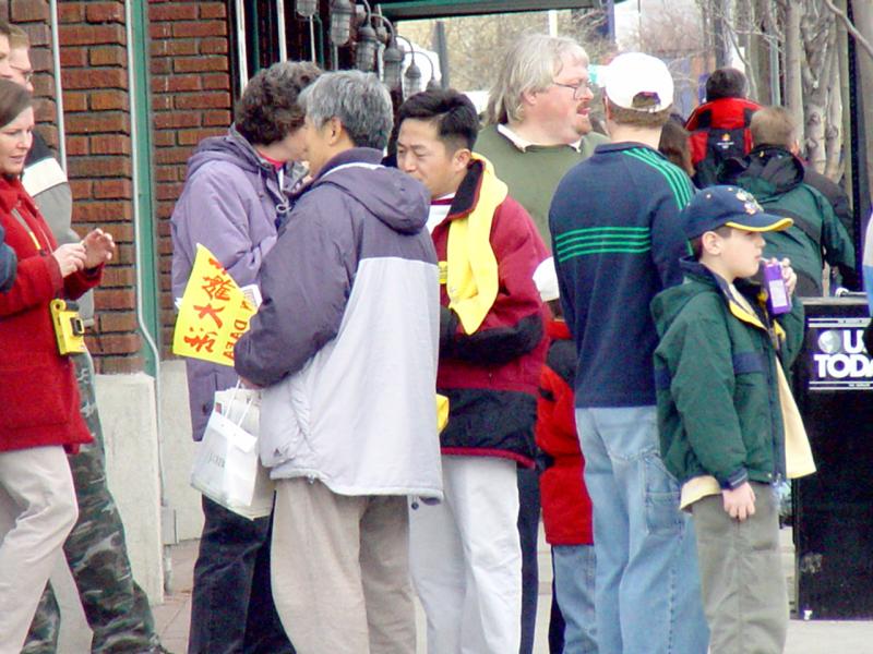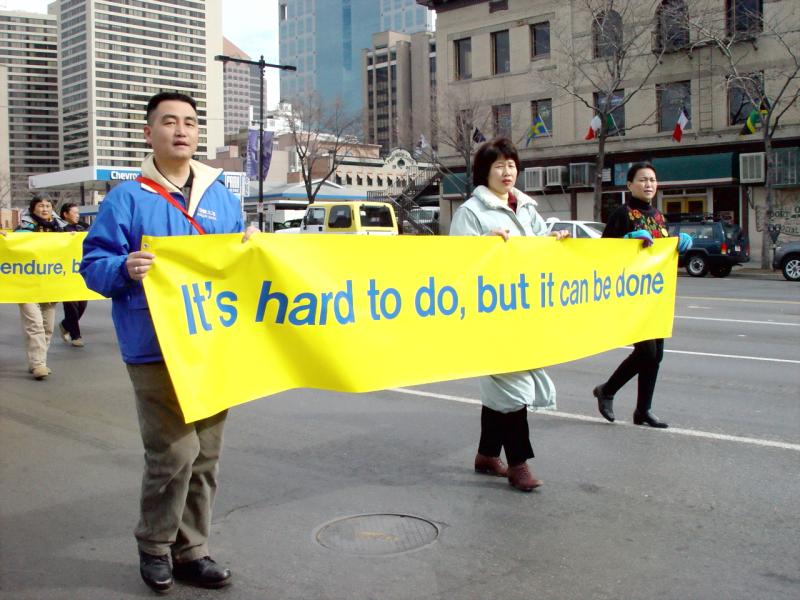 我想人都有明白的那一面吧。就像这次步行中,那两个小学低年级的小朋友,他们也许不知道什么是中子、原子,哪里是欧洲、美洲,但他们修的不一定比大人差: 他们炼起功来有模有样,在这个淘气、好动的年纪,他们打坐可以坐四十几分钟。我走着走着,眼眶竟微湿,却说不出来究竟为了什么。我想起去年七月在华盛顿DC的全球紧急救援游行中的情景。当时我在队伍最后面发着传单,发着发着突然心头一酸,我想到师父、想到大陆学员,也想到了自己,顿时泪如泉涌。我赶紧跑到人行道的树旁,手足无措地赶忙将眼泪擦干。这种心底的感动至今难忘。