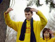 | 电台记者采访 | 记者们学习法轮功功法 | |