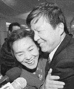 【明慧网2002年2月28日】图:昨天,李进宇喜悦地拥抱刚刚抵达多瓦尔机场的丈夫林慎立。林先生因为炼法轮功而在中国被监禁了两年。蒙特利尔报(Montreal Gazette)记者苏.蒙哥马利(SUE MONTGOMERY)在2002年2月26日的一篇报导中写道:在过去的两年里,李进宇女士始终不渝地给她丈夫写了几百封信。她丈夫因为信仰法轮功而遭到中国(江泽民)政府的监禁和折磨。