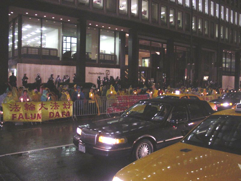 1月31日晚,大约200名法轮功学员在世界经济论坛会场曼哈顿华尔道夫大饭店前面举行了一次烛光悼念活动。这是前来参加大纽约地区经验交流会的学员们举行的许多活动之一。这些活动的中心目的是为了向商界精英们讲清在中国发生的这场迫害的真相。