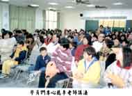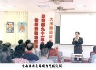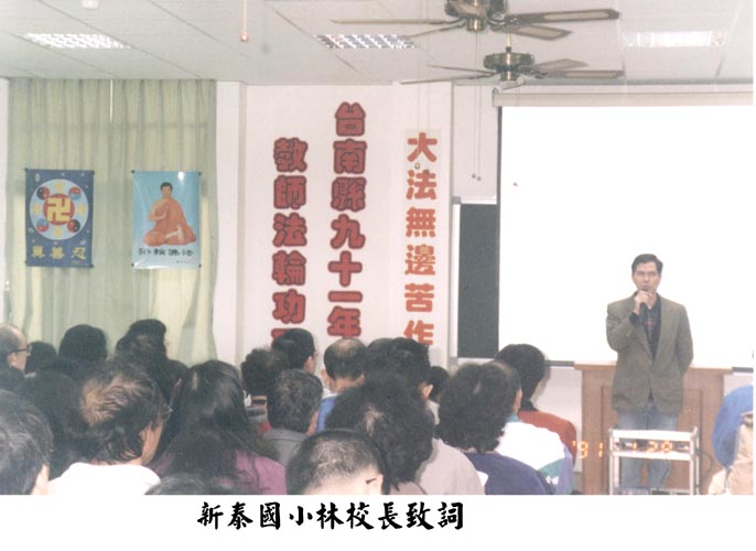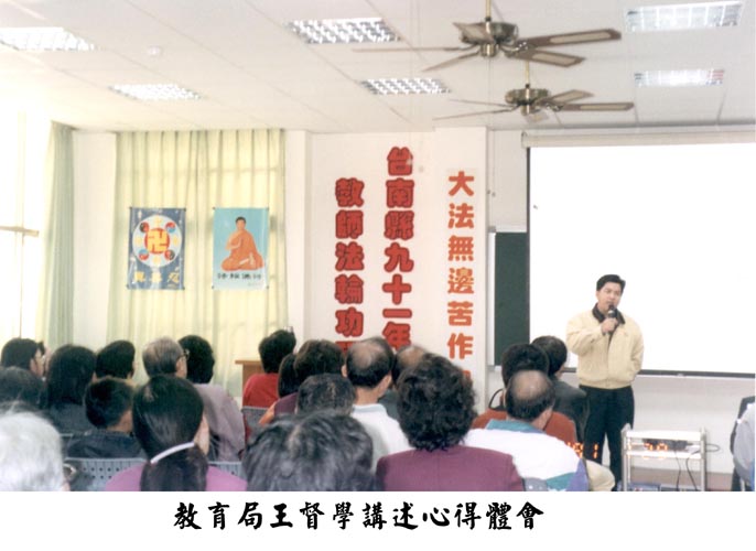 研习到了最后一天下午,台南县县长来了,在场的教师们喜出望外,县长的莅临,让研习会场更添光彩,让我们感到大法受到了更大的肯定与支持。县长开头第一句话说:同修们大家好。原来县长早已把《转法轮》读过了,五套功法也研究过了。他又表示法轮功传播速度非常快,法轮功已成为中共的人权指标,世界各国都注视中国政府怎样处理法轮功问题,这也就是说中国政府是否真正的走向民主的一大考验。他更期勉大家,精进修炼,使社会更祥和,身体更健康。苏县长说因为刚选举完,上任不久,公务繁忙,等忙过一段时间,也会找时间跟我们一起学习,一起修炼,大家听了都给予热烈的掌声。