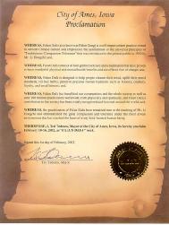 【明慧网2002年2月7日】鉴于法轮大法修炼者们坚持李洪志先生的教导,并且他们在最艰苦环境下所表现出来的大善大忍已经触动了每一个善良人的心。美国爱荷华州爱美思市市长泰德.太达斯库(Ted Tedesco)宣布2002年2月10日至16日为“法轮大法周”。