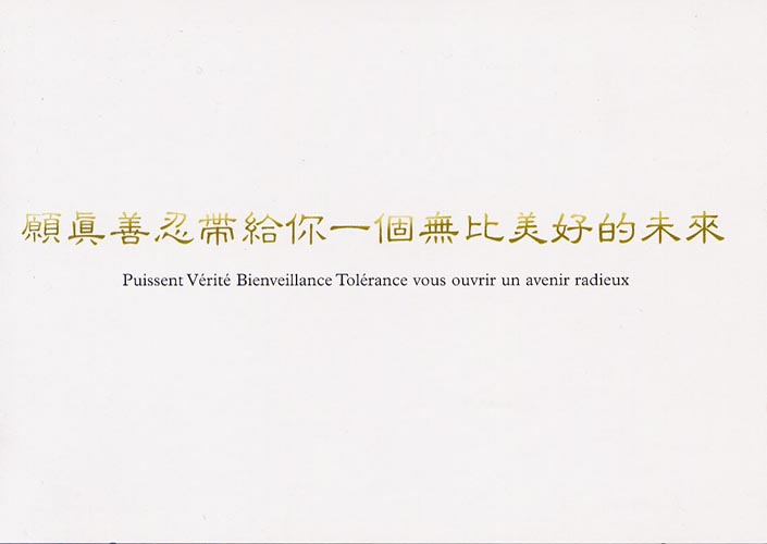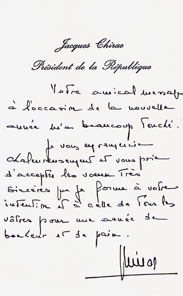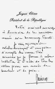 【明慧网二零零二年二月八日】2002年新年伊始,法国法轮大法协会主席与一位副主席以法国全体法轮大法学员的名义给法国总统雅克·希拉克先生(Jacques CHIRAC)寄去贺年卡,表达良好祝愿,愿真善忍带给他无比美好的未来。总统先生很快就亲笔给协会回信,内容如下: