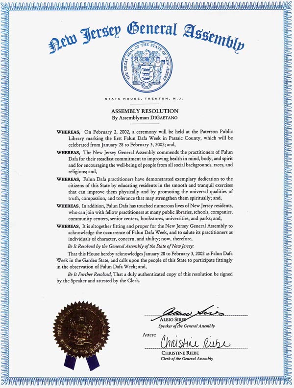 该决议由众议员蒂格塔奥(DiGaetano)先生提议,在2002年2月2日举行的帕赛克县“法轮大法周”的庆祝仪式上正式宣读。