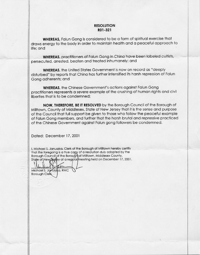 为此,新泽西州米得塞郡米尔敦市(Borough of Milltown, County of Middlesex, State of New Jersey) 市议会决定:本政府机构旨在全力支持那些以和平的法轮功学员为榜样的人们,并谴责中国政府对法轮功学员的残酷迫害和镇压。