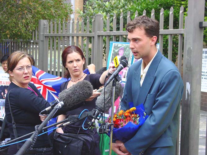 大卫说:“我们去天安门呼吁中国政府,告诉人民法轮大法好。中国几千万人炼功,法轮功是和平的好功法。但绝大部份人不知道法轮功好,这是令人吃惊的,中国(江泽民)政府煽动仇恨情绪,挑动人民反对自己的人民。政府迫使公司解雇法轮功学员。法轮功学员被迫失去工作,从公房里被驱逐出来,流离失所。中国几千万的法轮功学员正在遭受这样不公的待遇,世界上很多的人却不知道中国正在发生这样的事。我们在天安门广场,打出‘法轮大法好’的横幅,并呼口号,当时吸引了一群人围观。几秒钟后,警察过来扯了横幅,并将我们塞进警车。在警察局,我们被搜身,所有物品被搜。我们要求和澳使馆通话,警方拒绝了。他们想干什么,就干什么,使得我们不可能告诉人们我们的真相。”