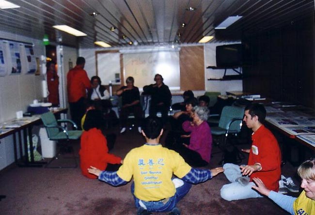 | 图一:这是2001年冬天我们应邀在游艇上展示法轮功。 | 图二:这是2001年夏天我们举行旨在让公众了解迫害真相的SOS紧急救援步行之前拍摄的照片。我坐在右边。 |