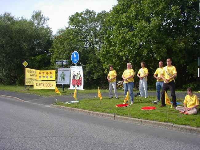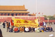 | 图三:这是2001年夏天我们在驻高森堡(Gothenburg)中国领事馆前炼功和请愿的图片。 | 图四:这是2001年11月36名西方法轮功学员在天安门广场和平请愿的图片。 |