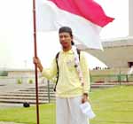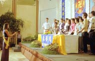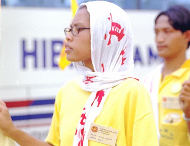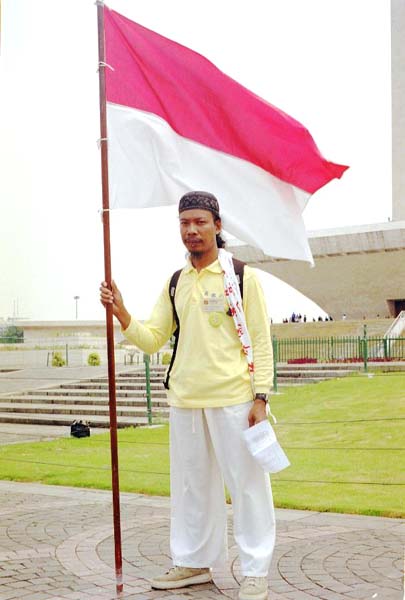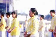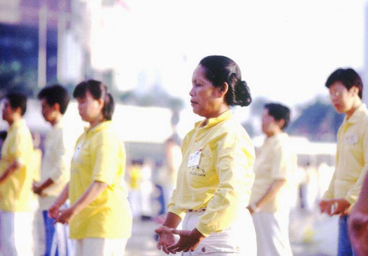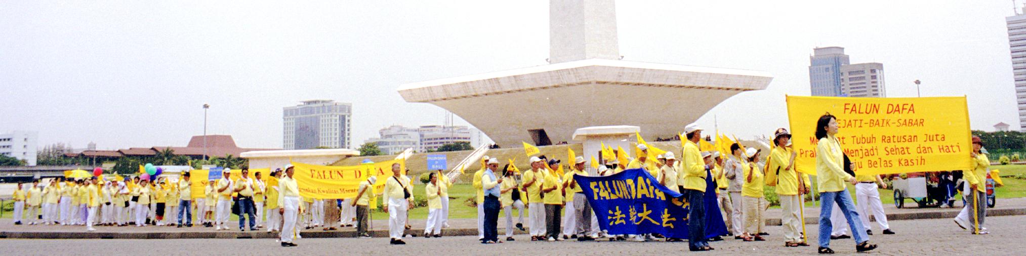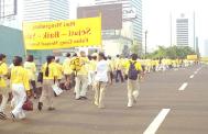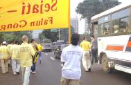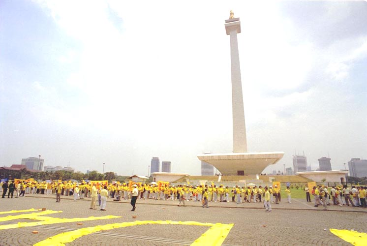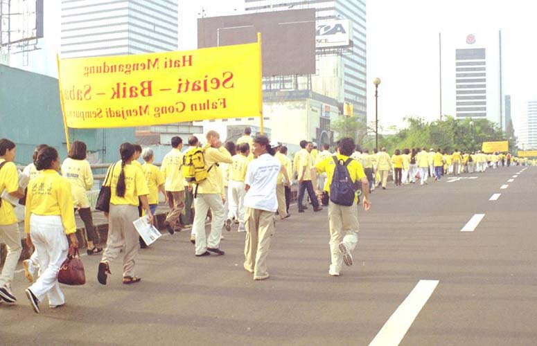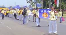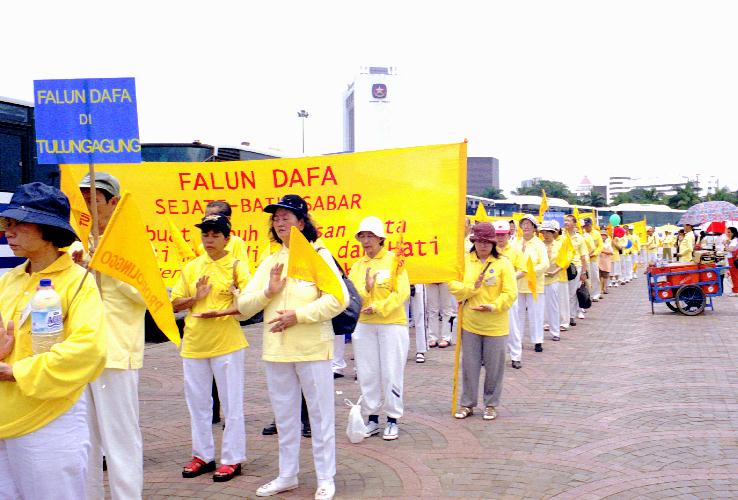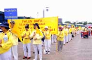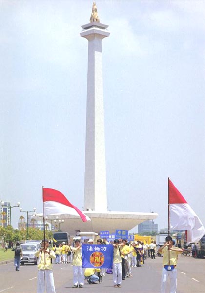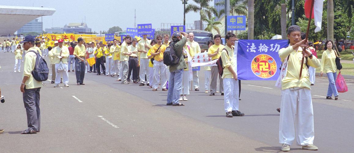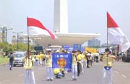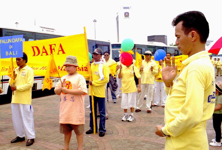 烈日当空、一些印尼女学员们裹起了印有“真”“善”“忍”的头巾。这几位学员们为了参加这次法会和游行先乘巴士、渡船历时十二个小时到泗水与泗水学员会合、再乘了二十四个小时的车,总共花三十六个小时的路程。正法、护法的心比起我们这些乘飞机来的如何?
