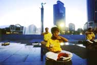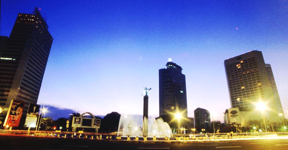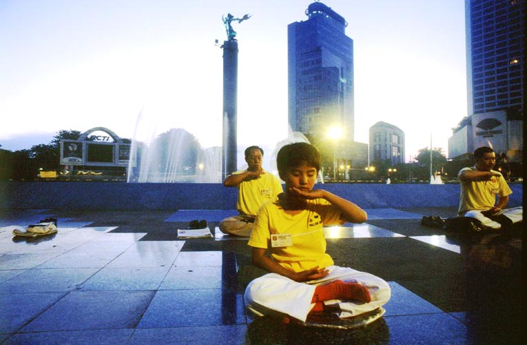 喷水池旁炼功(雅加达省最大的Bundaran Hotel喷水池)
