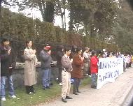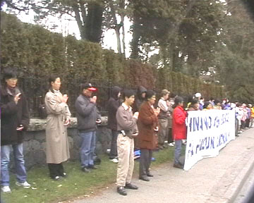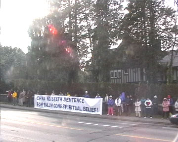 当温哥华学员知道了江泽民政府将大开杀戒,判处法轮功学员死刑,并扩大至各个省的消息后,决定尽快将消息通告媒体及世人,呼吁各界紧急救援处在危急中的中国法轮功学员,同时提起世人的警觉,救度更多的众生。大家纷纷来到中领馆前。醒目的巨额横幅,以及学员们安静的炼功场面,在车水马龙的领馆前吸引了所有过往车辆的目光,司机们纷纷鸣笛致意,或竖起大拇指表示支持。