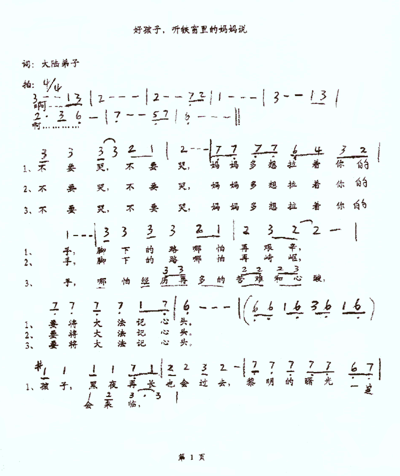 好孩子 听铁窗里的妈妈说(歌谱:第一页第二页)