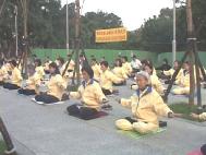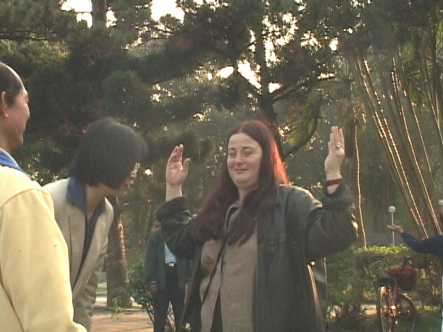 “每天都有你们的学员在中国使领馆前炼功,他们十分安静,令人印象深刻。”她轻声地询问学员法轮功五套功法的意义,也关心台湾法轮功发展的情况。学员笑着感谢她远道而来能经由新闻局的安排来了解法轮功,并且告诉罗洛哈拉女士,台湾的法轮功学员在这个自由民主的社会里炼功学法是合法的,台湾的总统以及许多行政首长都能理性地了解法轮功是对人民身心有益的功法,与中国江泽民政府无理残酷的打压,是截然不同的对比。当罗洛哈拉女士神情专注地看着学员在荣星花园里一遍又一遍地炼功时,止不住一次又一次地赞叹学员的庄严平和,于是学员问她是否有兴趣当场学功,亲身感受一下功法的殊胜,罗洛哈拉女士对于这个突如其来的建议感到有趣,表示愿意尝试,老学员洪吉弘先生便立刻热心地教她第一套和第二套功法动作,十分钟不到的时间,当罗洛哈拉女士放下两臂时,她高兴地告诉学员,她真的感受到有能量在她身上运转,觉得身体很舒服,回台拉维夫后她一定会念完《转法轮》以及我们所送给她的资料。