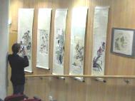 走进展室,各类题材的绘画作品琳琅满目,既有工笔人物也有写意山水。从憨态可掬的澳洲树熊到睡意惺忪的古代仕女;从古代幼童们的恣意玩耍到山清水秀的田园风光,体裁广泛,形式多样。而工笔画像《大慈大悲观世音菩萨》与我们经常看到的观世音的画像迥然不同,在章翠英的笔下她是一位清纯脱俗的少女形象。最引人注目的是悬挂在中央的三幅法轮世界觉者的画像。巨大的法轮不停地旋转,觉者持手印或站立或端坐在莲花台上,无限的慈悲而又无比的威严。一群仙女手持花篮怡然自得地飞翔天际,满天祥瑞弥漫美妙的天国世界,令人神往。站在画前,仿佛人也在画中,身心沐浴在无尽的甘露之中。“思飘云雾外,人入画图中”,令人物我两忘。
