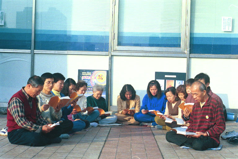 【明慧网2002年3月14日】我们炼功点上固定每天有10来个人晨炼,早上4:30分左右开始炼第五套功法,炼完后发正念十分钟,再炼第一、三、四套功法(单日)或第二套功法(双日)。功炼完后天色也亮了,大家开始学法交流(见图)到清晨7点多。点上学员都以负责人的标准要求自己,从学员自身做起对自己负责也对大法负责。目前学法交流的时间,我们轮流由学员当负责人。原则上,一人负责一个礼拜,让大家都有机会当学法交流的主持人。在主持学法交流中学习怎样用简练的语句表达自己对法的理解。透过这样的学习,一方面增强学员在讲清真相中表达的能力,另方面尽量让每个人都有机会在大法工作中得到磨炼。