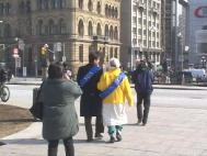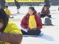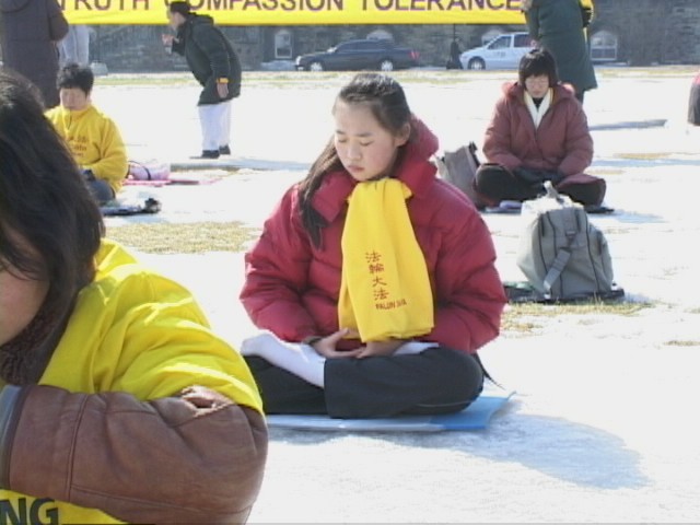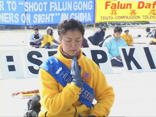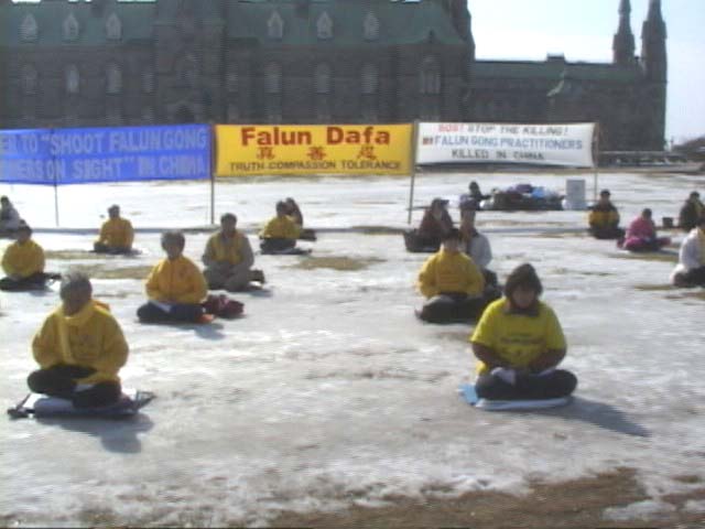 今天(3月13日)是第一天。清晨,9点钟,天灰蒙蒙的,第一批绝食学员已到达国会山上。11点,第二批50多人到达,在早春的料峭寒风中,学员们坐在消融的残冰上炼功、发正念,背后是写有“制止中国枪击法轮功学员” “紧急营救:在中国被虐杀的法轮功学员” “法轮大法”等字样的横幅。学员们的正念之场笼罩着偌大的国会山庄。