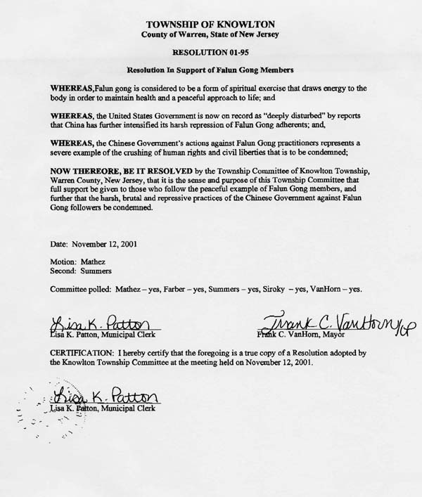 鉴此,新泽西州华伦郡诺尔顿镇委员会决定,本镇委员会旨在全力支持那些以法轮功学员和平典范为榜样的人们,同时谴责中国[江泽民]政府对法轮功成员残酷,野蛮和镇压性的做法。