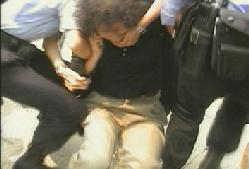 让我们再来看一看下面两幅照片。第一幅(图三)是至少四个警察在拖拉一位法轮功学员。另外一幅照片(图四)是一法轮功学员倒在地上。在这种情况下警察说法轮功学员把他们踢伤,就如同狮子指责即将被它扑倒的羚羊在挣扎时踢伤了它。