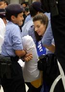2002年3月14日,当一名当地修炼者(左)在香港中联办外进行绝食抗议而被警察带走时,西蒙史雷格(Simone Schlegel) (中间),一名来自瑞士的法轮功修炼者正在打坐。星期四,一组瑞士法轮功成员与在香港当地的追随者举行抗议,敦促中国停止镇压该被取缔的精神运动。(路透社/ Bobby Yip)