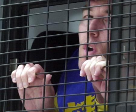 2002年3月14日,星期四,瑞士法轮功修炼者艾立克巴赫曼在香港中联办外被警察带走时,在警车中呼喊口号。香港警察逮捕了16名法轮功追随者,包括在中联办外举行抗议并拒绝要他们挪走的命令的四名瑞士人。这群瑞士人发愿绝食三天以抗议中国据说拒绝他们进入大陆向北京表达消息。(美联社图片/ Vincent Yu)