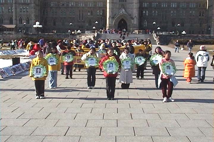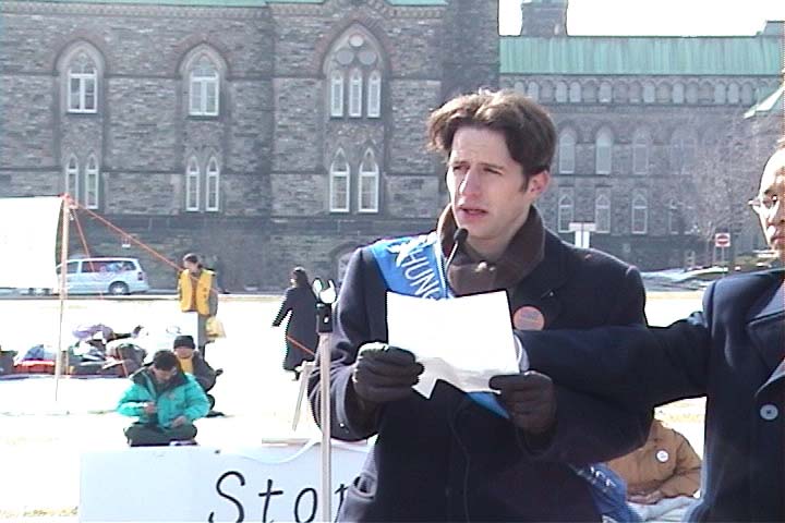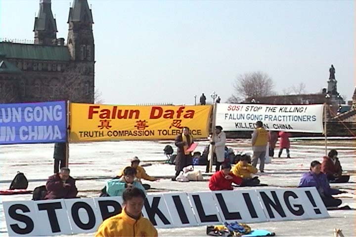 渥太华国会山庄的任何活动都必须提前48小时申请,而这一次破例,紧急的36小时绝食行动立刻就被批准了,并且是第一次允许在国会山庄广场过夜。工作人员怕我们绝食的学员在冰天雪地中寒冷,晚上主动告诉我们,让我们学员坐在路边水泥地上。