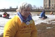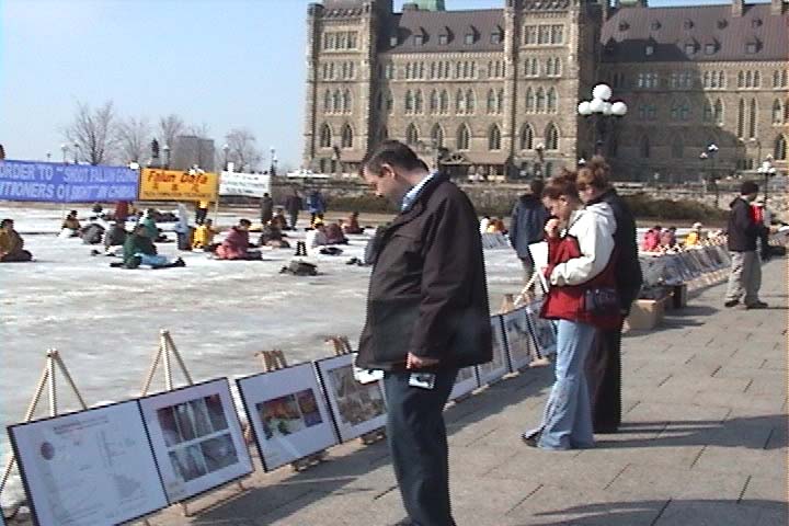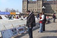 清晨,悠扬的大法音乐迎来了渥太华第一缕曙光。一夜未眠的法轮功学员开始了晨炼。中午,上班的人们开始了忙碌的午餐,学员们在冰面上宁静祥和的炼功场面留住了人们匆匆的脚步,一张张真相传单告诉着人们今天在中国大陆发生着的残酷事实。夜幕降临了,盏盏烛光在寒风中摇曳。草地上的巨大投影屏幕正在放映着《自焚真相》、《法轮大法在世界各地洪传》等影片。一幅幅画面震撼着人心,人们久久站立在屏幕前忘记了离去。