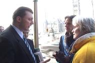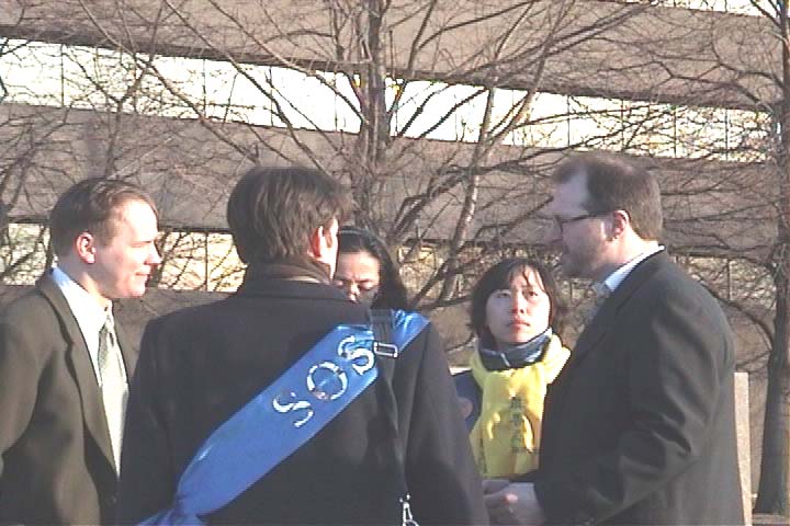 在现场当曾经到天安门广场告诉世人“全世界都知道法轮大法好”的西人法轮功学员泽农在接受记者的采访时,全然不知一名国会议员正在他的身边静静地等候着。当泽农与这名国会议员交谈时,议员有感而发地说:“你们真了不起,你们知道吗?从国会山庄办公室的窗户里,我们看到你们一个个在雪地上整齐地排列着,默默地为中国的法轮功学员呼吁,许多议员都感动了,大家都在交谈这件事,你们太了不起了!”这名国会议员让泽农明天下午无论如何都要到他的办公室去见他,事后我们的学员才知道这名议员是负责亚太地区的国会议员。