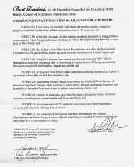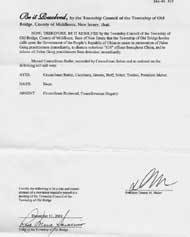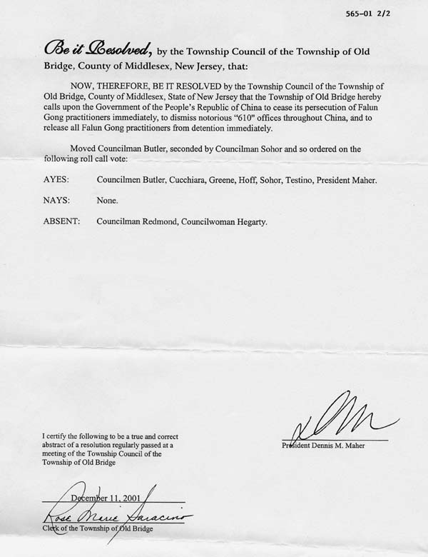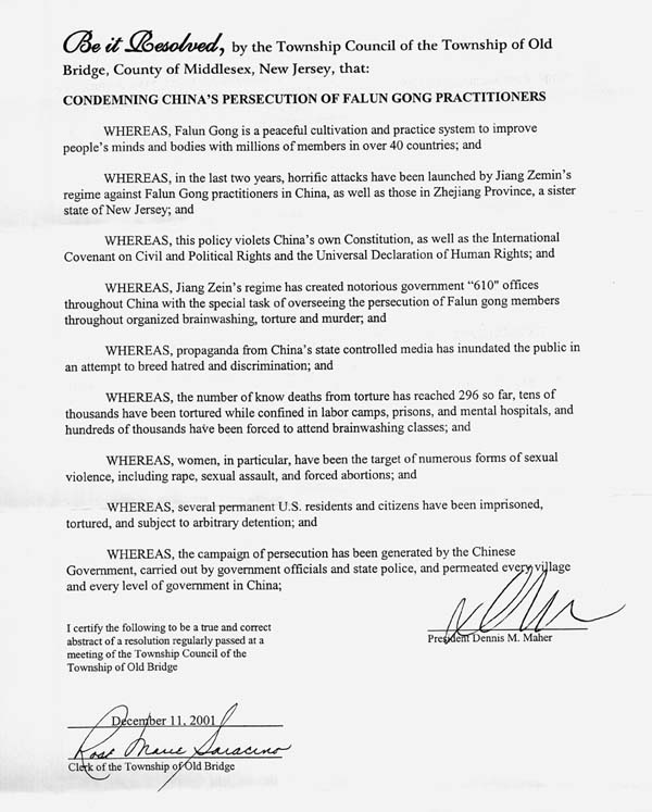 新泽西州米多赛克斯郡老桥镇镇议会(Township Council of the Township of Old Bridge, County of Middlesex, New Jersey)通过决议:谴责中国(江泽民)对法轮功学员的迫害