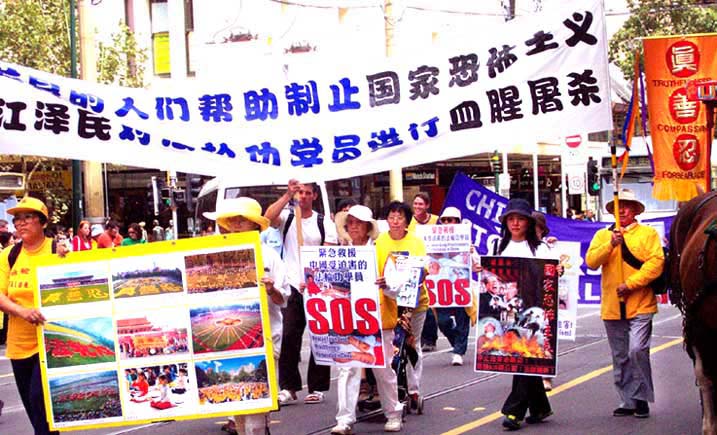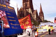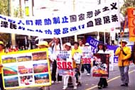 游行队伍经过闹市区,一辆播放着大法音乐、上载大型炼功图片的卡车缓缓开道,后面跟着几十米长的游行队伍。行人们纷纷驻足观看,学员们沿途散发材料,讲清真相,