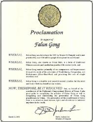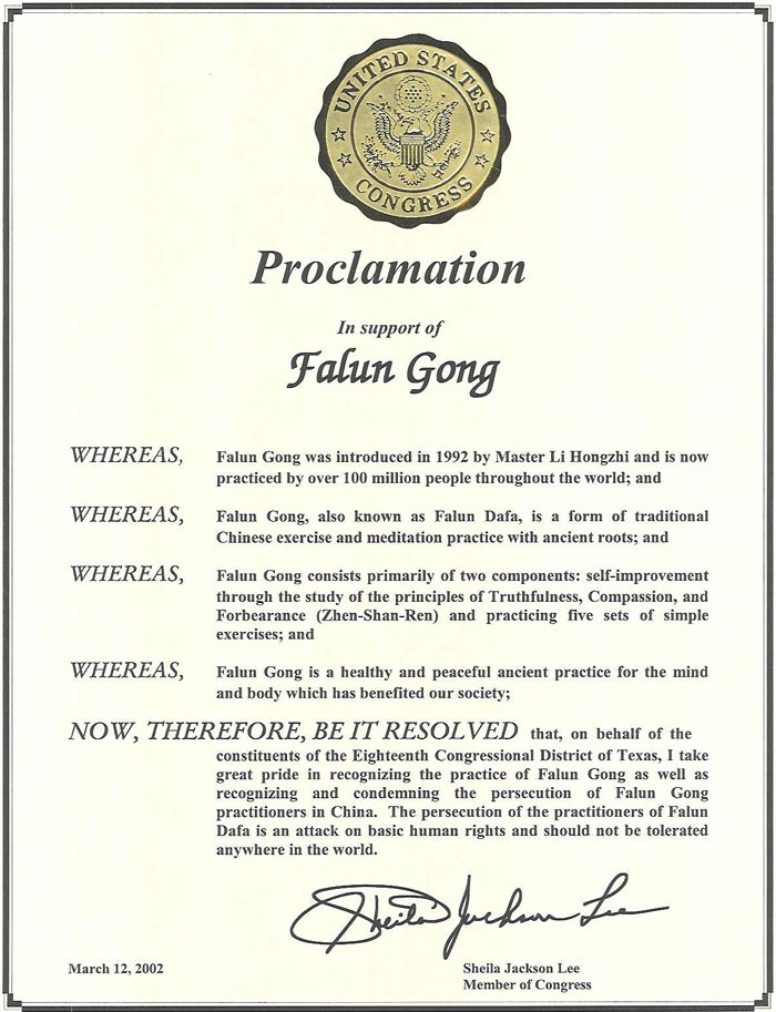 因此现在,我决定代表德克萨斯州国会第十八选区的选民,非常自豪地宣布:表彰法轮功,同时承认法轮功修炼者在中国遭受迫害的事实,并对这种迫害予以谴责。对法轮功学员的迫害是对基本人权的侵犯,在世界任何地方都不应该容忍。