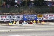 学员们陆续自发来到中领馆门前。有位六十多岁的阿姨,家住另一个城市,也设法及时赶到。现场挂起了学员连夜赶制的巨型横幅,Stop The Killing!(制止虐杀) Stop order “To Shoot Falun Gong Practitioners On Sight” in China! (制止中国枪击法轮功学员!)有的学员用点燃的蜡烛组成“正法”字体图样,在夜幕下,熠熠生辉。