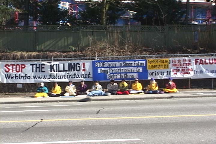如今江泽民政府一意孤行,将上亿人推向政府的对立面,与真善忍为敌,下达开枪令,令天地为之震怒。在这万分紧急的关头,温哥华部分法轮功学员走向中领馆集体绝食静坐,呼唤正义,呼唤良知。紧急呼吁全市人民关注这一罪恶行径,和我们一起制止酷刑,制止开枪虐杀。请您勇敢地走出来为正义说句公道话。