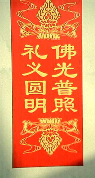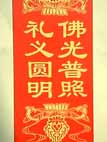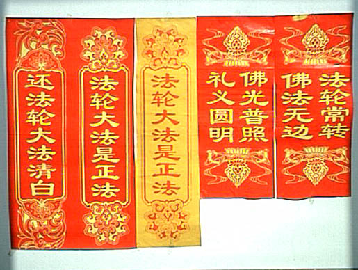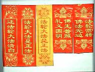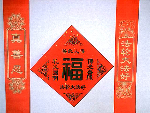 大法弟子设计的用红纸做的、菱形样式、中间是大“福”字的(见照片-上面一行字是“善良人得(福)”,两边是“佛光普照,礼义圆明”,下面字是“法轮大法好”)有墨、锡箔两种印制,大法弟子在大街、楼群张贴,有的常人见后,非常喜欢,或驻足观赏,或小心翼翼地揭下(我们是用双面胶与红蜡光纸、普通红纸贴合在一起,其粘力极强,如要揭下很难,即使用小刀刮碎也不可能揭下,因为这些善良的人心存善念、正念,神奇的完好无损的揭下)贴在了自己家的大门两侧。