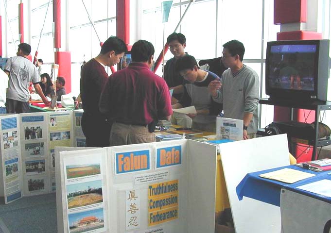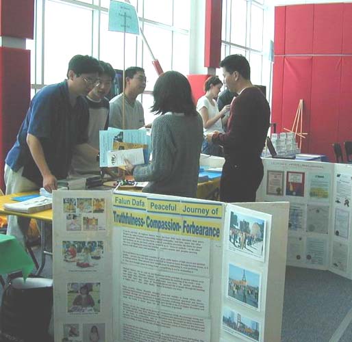 整个活动中,先后有各种族裔的上百人来问询和了解法轮大法。学员们带去的英文版真相VCD和各种传单,彩色真相图片等被索取一空。学员制作的软盘版本的大法书籍也送给了有缘人。一位华裔同事还借走了《转法轮》回去阅读。几乎来到我们展位的人都不约而同的有一样的问题:为什么江氏集团要迫害这么平静祥和的功法?学员们耐心向每一位讲迫害真相的来龙去脉,指出了邪恶集团卑鄙无耻的和毫无人性的本质,不少人听后都表示对在大陆继续修炼不放弃真理的法轮功学员的钦佩,同时也感谢学员们提供这样的机会让他们了解大法。