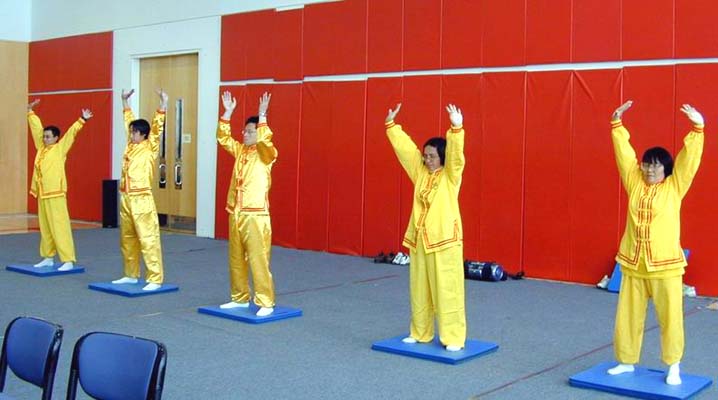 期间,学员们还身着黄底红边的炼功服给所有观众演示了五套功法。不少人表示将参加由学员每周定期在公司活动中心举办的教功班。