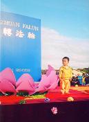 看到家里人在炼功,他会站在旁边模仿比划着,有几个动作做得非常好,大人们表扬他,他会高兴得手舞足蹈。有时爸爸、妈妈、外公、外婆坐在那儿说话,他就把师父的书一一塞到他们手里,谁正在看哪一本他都知道,一点儿也不会搞错。虽然他还不会说话,但家人明白他的意思是要他们抓紧时间学法。看到小孩这样明白,一家人更精进了。最近,小艾伦也开始精进了。每次一家人去领馆,离领馆还有两,三分钟的车程时,坐在小孩车座上的小艾伦一个人神情严肃的单手立掌发正念,直到车开到领馆门口停下。大人们打横幅,他才开始玩他自己的。