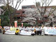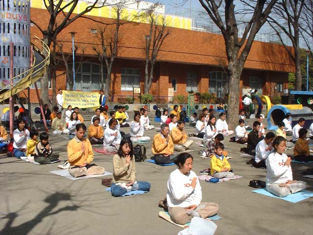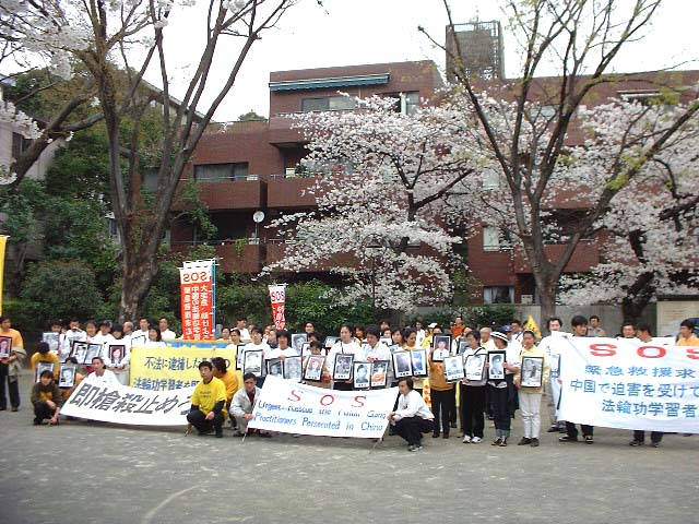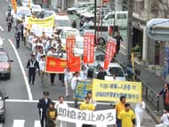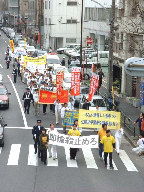 早上9点55分起,来自东京,横滨,千叶,琦玉及从仙台、长野、静冈和山形等远程而来的共150位法轮功弟子在强风流沙中三发正念后,于中午1点从惠比寿公园出发,途经中国使馆所在的繁华街区。清脆亲切的真相广播在悠远祥和的大法音乐中穿透滞重的空气将法轮功真相传向远方,透明亮丽的法轮功横幅冲洗着迷蒙的尘埃给人们带来的压抑,引得沿途车辆路人停下脚步注目观望。打在队伍前面的大横幅告诉了行人此次游行的主题:“立即停止江泽民集团的枪杀”“紧急救援被非法逮捕的长春法轮功学员”。人行道上奔走着的十余位小弟子是讲清真相的主力军,天真烂漫的目光引来无数行人索要真相资料的手。队伍在齐发正念中经过中国使馆附近,狂风袭来处大法横幅拉得更直,更醒目。牵引着3个孩子,步伐稳健的母亲吸引了到场采访的AP通信社记者一连的拍摄。