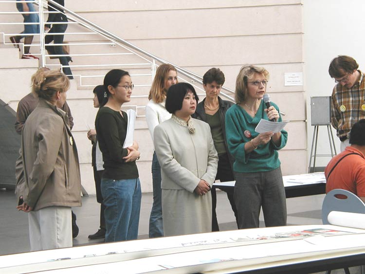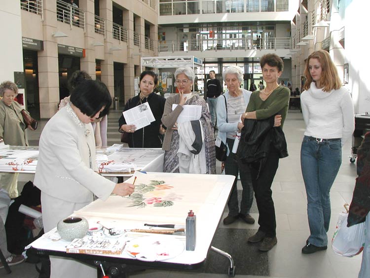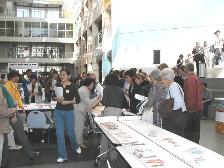 每当学生下课高峰时间,还在厅内举办章翠英介绍、法轮功介绍会以及章翠英即兴作画表演,吸引了很多学生。章翠英的山水、仕女图复制件及画册等受到了参观者的好评和喜爱。