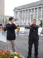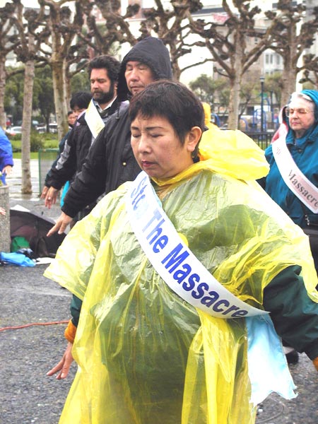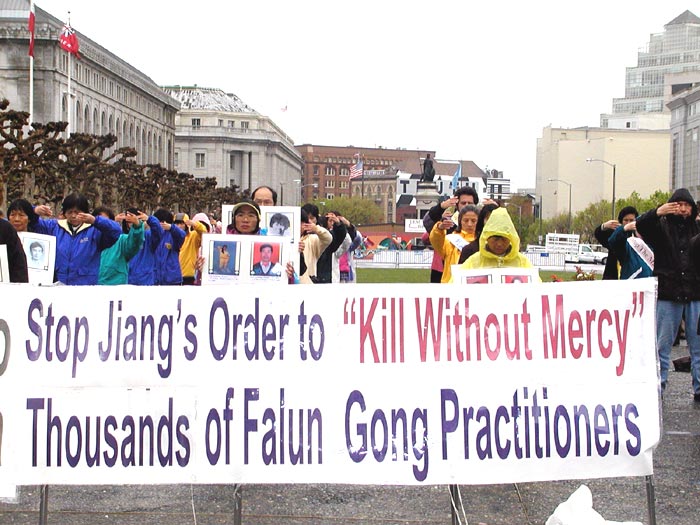 3月22日星期五,旧金山近40名学员冒着蒙蒙细雨来到旧金山市政府面前,继续已进行一周的请愿,呼吁旧金山市政府关注江泽民流氓政权下达的枪杀法轮功学员的严重事态。