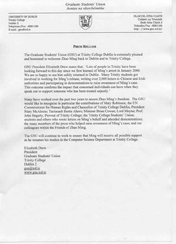 在过去两年中,很多人都为赵明获得自由作了工作。都柏林三圣大学研究生会特此感谢以下人士所做出的贡献:都柏林三圣大学名誉校长,联合国人权高级顾问玛丽·罗宾逊夫人、玛丽·麦克艾丽丝总统、博提·埃亨总理、布莱恩·考文外交部长、莫恩勋爵、三圣大学校长约翰·海格提教授、三圣大学学生会、学生和其他为赵明写信呼吁和请愿的人、参加这次新闻发布会的很多为呼吁对赵明事件关注而努力的人,以及我们“赵明之友”的同事们。