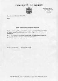 都柏林三圣大学校长(Provost)约翰·海格提教授代表三圣大学欢迎研究生赵明先生重返爱尔兰,并盼望和他见面。