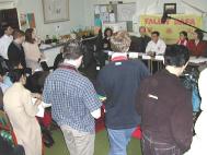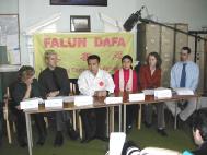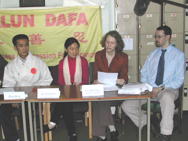 | 从左至右:国际特赦代表、吉姆·道林、赵明、戴冬雪、伊丽莎白·德路、布郎恩·珊瑞 | 赵明在回答记者提问 | 伊丽莎白·德路宣读三圣大学校长约翰·海格提教授的致辞 |