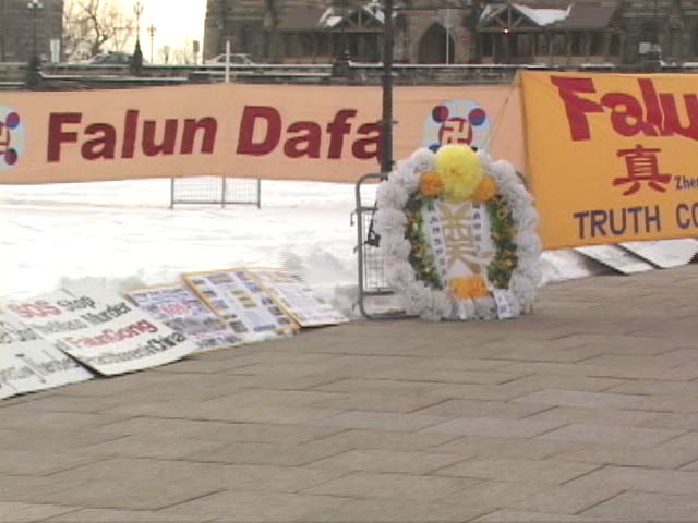 下午3:00,两地学员陆续赶到国会山前,请愿活动开始了。在覆盖着厚厚的积雪的广场上,学员们竖起了醒目的横幅,上面用英文写着“紧急救援:停止发生在中国的国家恐怖主义”,“停止对法轮功学员的射杀令”、“近日5000名无辜百姓遭绑架,100人被谋杀!”、“制止江泽民的‘杀无赦’”……在通往国会大厦的人行道上,一排展板和标语提醒着过往行人发生在中国迫害。由黄白两色菊花装点的硕大的花圈凝聚着对维护真理的修炼者的深深的敬慕与哀悼。挽联上写着:护天理拒邪恶威德贯乾坤,救众生慈悲感天地!