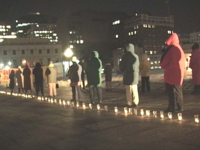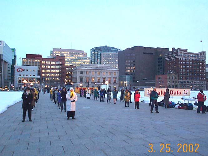 【明慧网2002年3月27日】近日来,江泽民政治流氓集团对国内法轮功学员的进一步升级。据来自国内的消息,3月5日长春电视播放法轮功真相片以来,据保守统计,迄今仅长春地区被绑架的大法弟子就有5000多人,几乎每天都有大法弟子被迫害致死,长春大法弟子处境非常艰难。据内部消息,现长春市每天都有大法弟子在刑讯中被迫害致死。”为制止江泽民的谋杀暴行,紧急呼吁加拿大各界民众积极采取各种有效措施制止发生在中国的国家恐怖主义和法西斯暴行,3月25日,加拿大渥太华和蒙特利尔两地70余名学员赶到国会山前举行为期两天的大型请愿悼念活动。