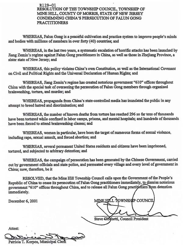 矿山市(Mine Hill Township)市议会:呼吁中华人民共和国政府立即停止对法轮功学员的迫害,撤销遍及全国的臭名昭著的“610”政府办公室,立即释放所有被关押的法轮功学员。