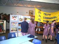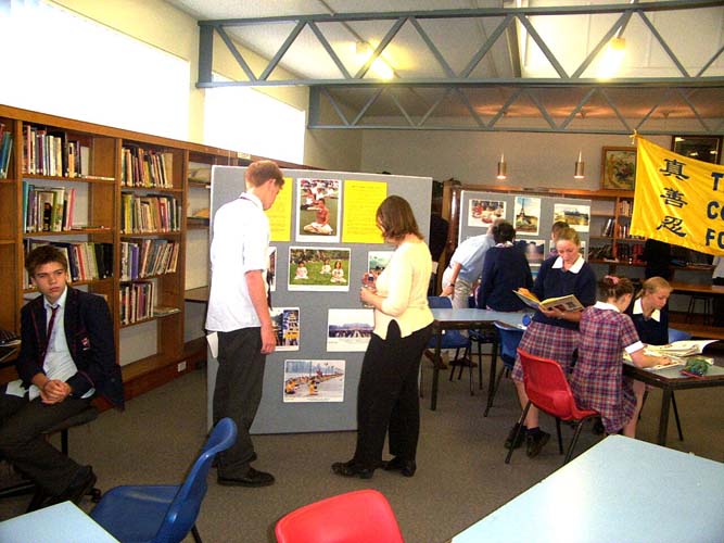 由于大法图片给人以强烈的视觉印象,副校长和图书馆的老师决定在校图书馆举办为期一周的“大法和平历程图片展”。值得一提的是,图书馆的老师把图片摆好后亲自拍了几张照片,并决定把其中最好的一张定为图书馆网页的封面背景图。主管教师职业发展与身心提高的教导主任还特意将法轮功定为老师发展与提高的选修课,第一堂课有十几位老师参加,包括副校长和两位教导主任。第二堂课原定在复活节假日后,由于学炼了第一和第二套功法后,他们觉得非常好,就要求法轮功学员把第二堂课提前。副校长说其它年级的法轮功讲座已在陆续安排之中。