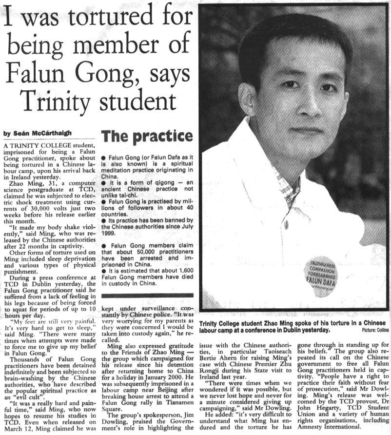 31岁的赵明是都柏林三圣学院计算机专业的研究生。他说就在他本月初获释的两个星期之前,他还受到三万伏高压电的电刑折磨。明说:“这使我的身体猛烈地颤抖。”他在被中国当局囚禁22个月以后获释。明受到的其它酷刑包括剥夺睡眠和各种肉体惩罚。